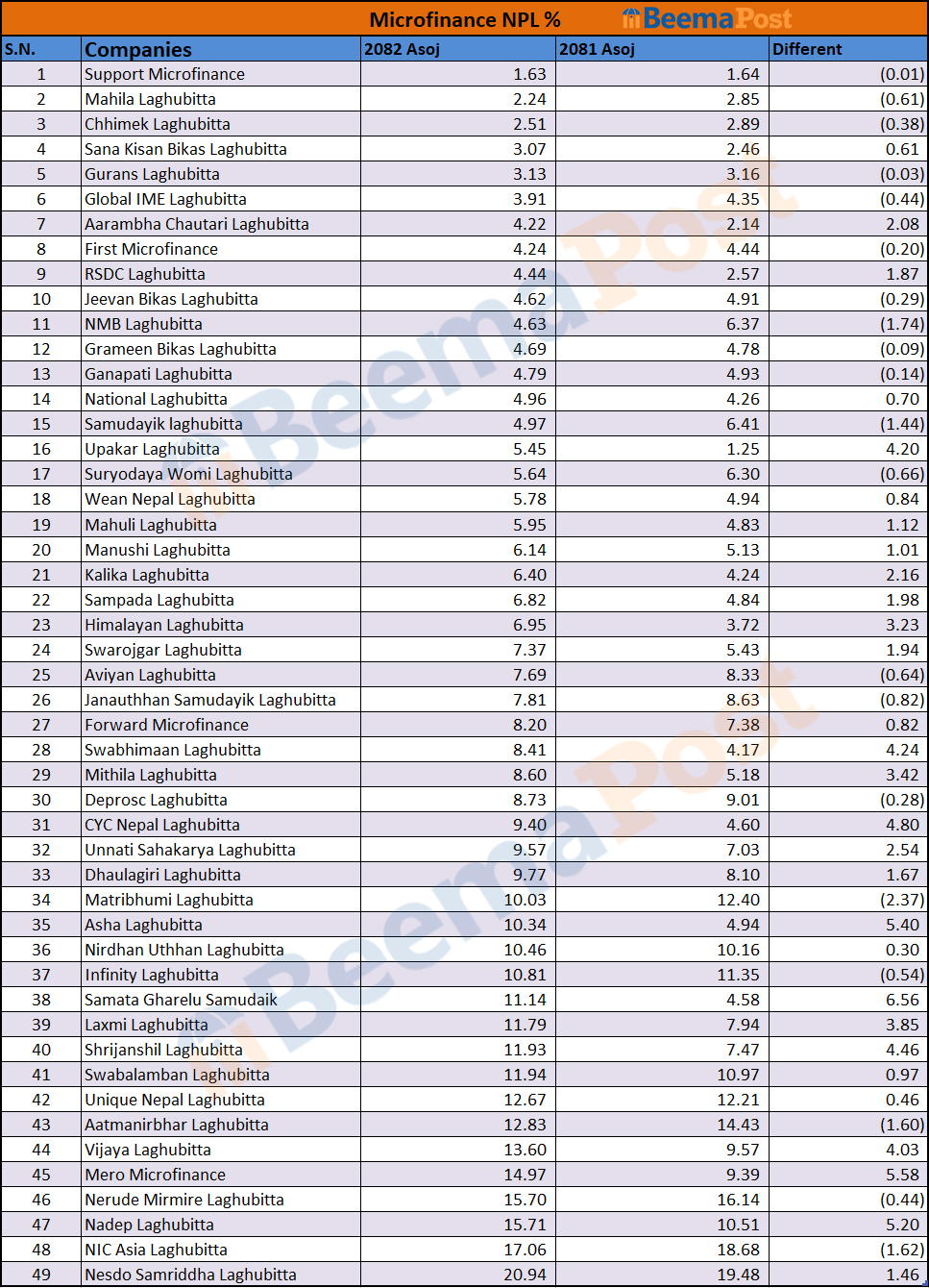 सबैभन्दा धेरै खराब कर्जा हुनेमा नेष्डो माइक्रोफाइनान्स रहेको छ। कम्पनीको खराब कर्जा २०.९४ प्रतिशत रहेको हो । यता, एनआईसी एशिया लघुवित्तको समेत खराब कर्जा १७.०६ प्रतिशत रहेको छ ।