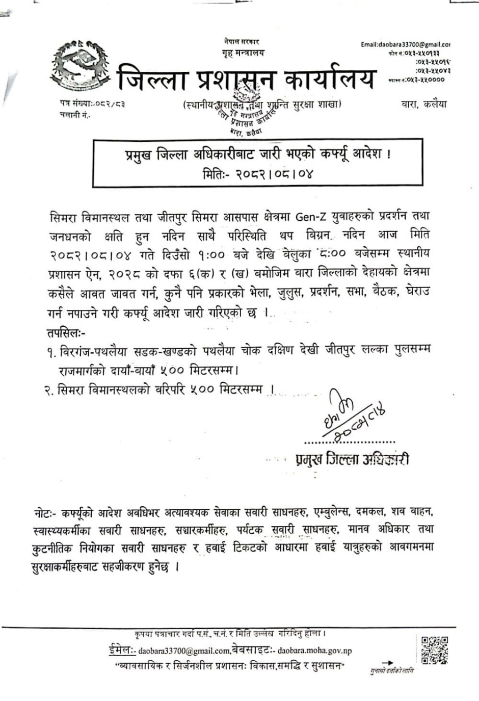 तनावग्रस्त स्थिति फैलिन नदिन सिमराको सीमित क्षेत्रमा कर्फ्यू लागू गरिएको छ। बुधबार एमाले बाराले आयोजना गरेको मधेश प्रदेशस्तरीय जनजागरण सभामा सहभागी हुन पार्टी महासचिव शंकर पोखरेल र नेता महेश बस्नेत सिमरा जाँदै गर्दा जेनजी समूहले विरोध गरेका थिए। विरोधका कारण उनीहरू विमानस्थलमै फर्कन बाध्य भएका थिए।