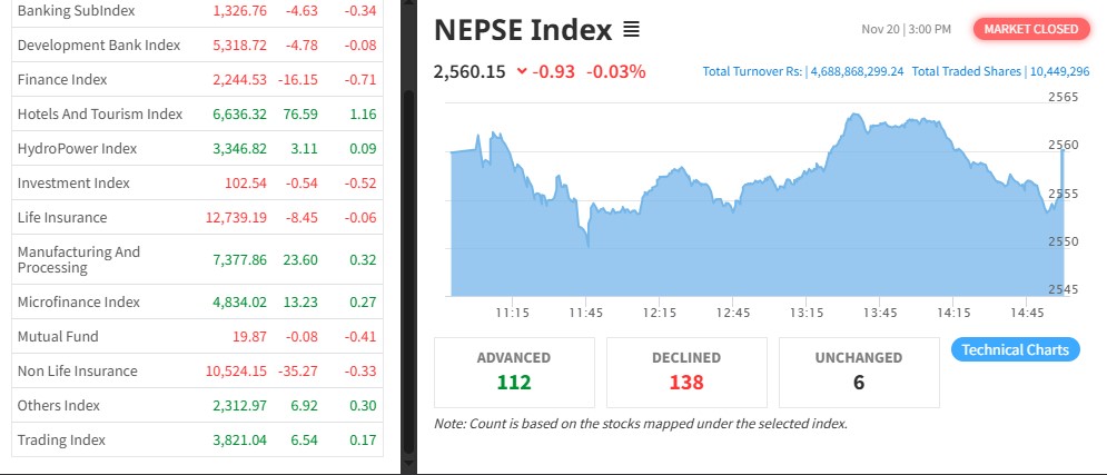 नेपाल स्टक एक्सचेञ्ज (नेप्से) ०.९३ अकंले घटेर २५६०.१५ बिन्द भएको छ । आज ३२८ कम्पनीको १ करोड ४ लाख ४९ हजार कित्ता शेयर किनबेच हुँदा ४ अर्ब ६८ करोड ८८ लाख ६८ हजार रुपैयाँको शेयर कारोबार भएको हो ।