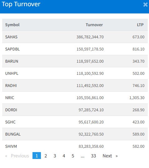 त्यस्तै, सप्तकोशी डेभलपमेन्ट बैंक, बरुण हाईड्रोपावर, युनियन हाईड्रोपावर, राद्यी विद्युत्, नेपाल रि, देर्दी खोला, श्वेत गंगा, बुंगल हाईड्र्रोपावर र शिवम् सिमेन्टसको सर्वाधिक कारोबार भएको छ।