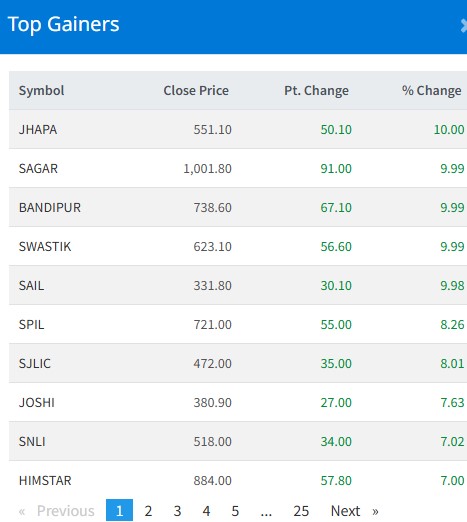 त्यस्तै, बन्दीपुर, स्वस्तिक लघुवित्त, श्री नगर, सिद्धार्थ प्रिमियम, सूर्यज्योति लाइफ, जोशी हाईड्रोपावर, सन नेपाल लाइफ, हिम स्टारका लगानीकर्ताले आज सर्वाधिक कमाएका छन् ।