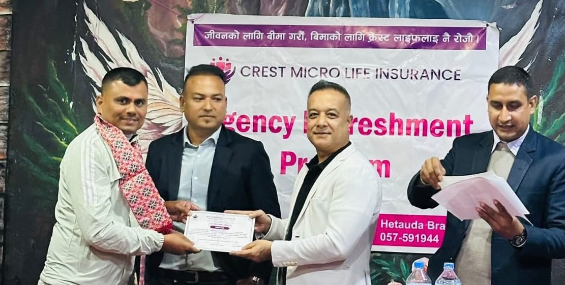 काठमाडौँ । नेपालको विश्वासिलो लघु जीवन बीमा कम्पनी क्रेस्ट माइक्रो लाइफको अभिकर्ता अभिमुखिकरण तथा सम्मान कार्यक्रम सम्पन्न भएको छ । कम्पनीका नायव प्रमुख कार्यकारी अधिकृत अभिजित केसी र बजार प्रमुख दिनेश खड्काको उपस्थितिमा अभिकर्ता अभिमुखिकरण तथा सम्मान फेमस तास हाउस रेस्टुरेन्ट हेटौडामा सम्पन्न भएको हो ।