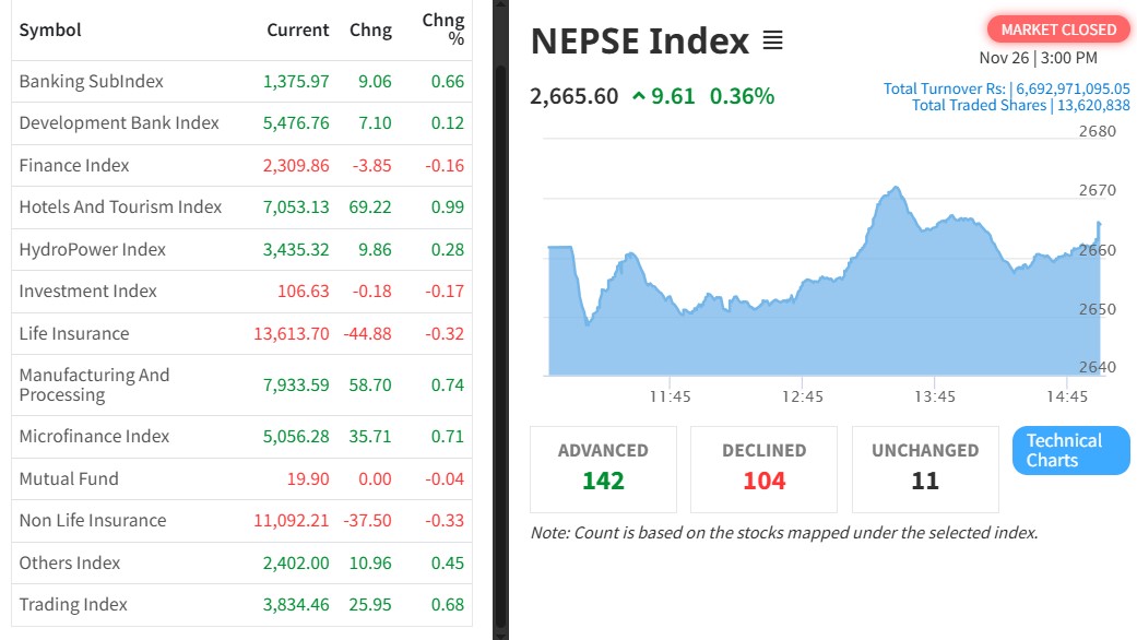 काठमाडौं । साता कारोबारको चौथो दिन अर्थात बुधबार शेयर बजार झिनो अंकले बृद्धि भएको छ । आज नेप्से परिसूचक ९.६१ अंकले बढेर २६६५.६० को बिन्दुमा कायम भएको छ ।