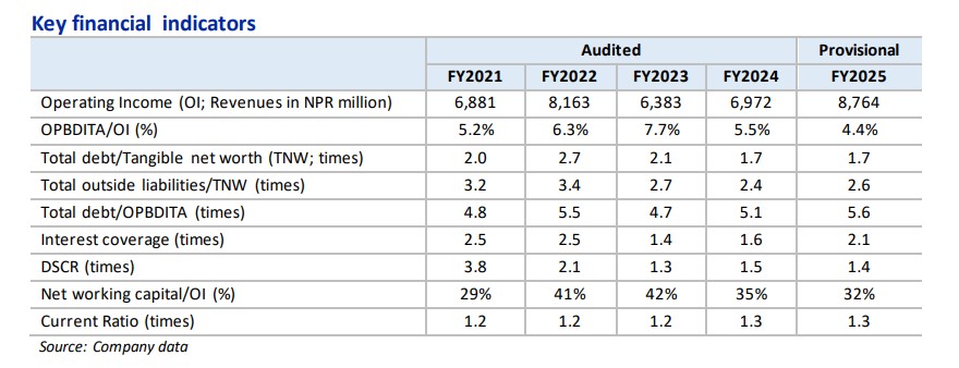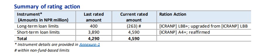 त्यस्तै, कम्पनीको स्वल्पकालीन ऋण सीमा भने ३,८९० मिलियन रुपैयाँबाट वृद्धि भई ४,५९० मिलियन रुपैयाँ पुगेको छ, र यसको स्वल्पकालीन रेटिङ ए फोर प्लस नै यथावत राखिएको छ। आइसीआरए नेपालद्वारा प्रकाशित विवरण अनुसार, यी ऋण सीमाहरू गैरनिधि आधारित सीमाभित्र पर्छन्, र सम्पूर्ण ऋण सीमाको आकार ४,५९० मिलियन रुपैयाँ कायम भएको छ।