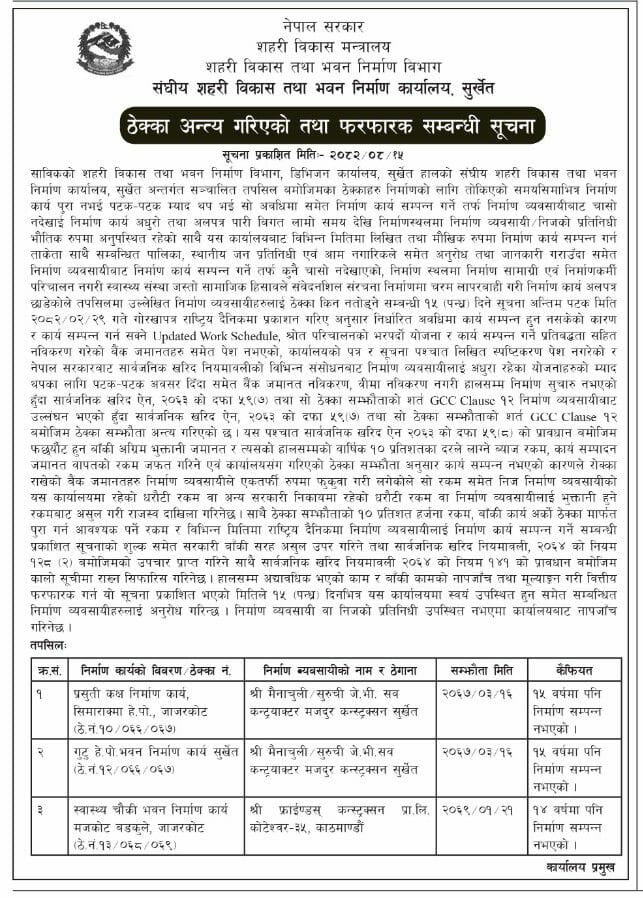 जाजरकोटको सिमाराक्मास्थित प्रसूति कक्ष र सुर्खेतको गुटु हेल्थपोस्ट भवन निर्माणको जिम्मा पाएको ‘श्री मैनाचुली/सुरुची जे.भी.’ ले २०६७ सालमै सम्झौता गरेको थियो। तर करिब १५ वर्ष बितिसक्दा पनि संरचना निर्माण अधुरै रहेपछि कार्यालयले ठेक्का रद्द गरेको हो। सोही गरी जाजरकोटको मजकोट बडकुले स्वास्थ्य चौकी निर्माणका लागि २०६९ सालमा सम्झौता गरेको ‘श्री फ्राइण्डस् कन्स्ट्रक्सन प्रा.लि.’ ले पनि १४ वर्षसम्म भवन तयार पार्न नसकेपछि कारबाहीमा परेको कार्यालयले जनाएको छ।