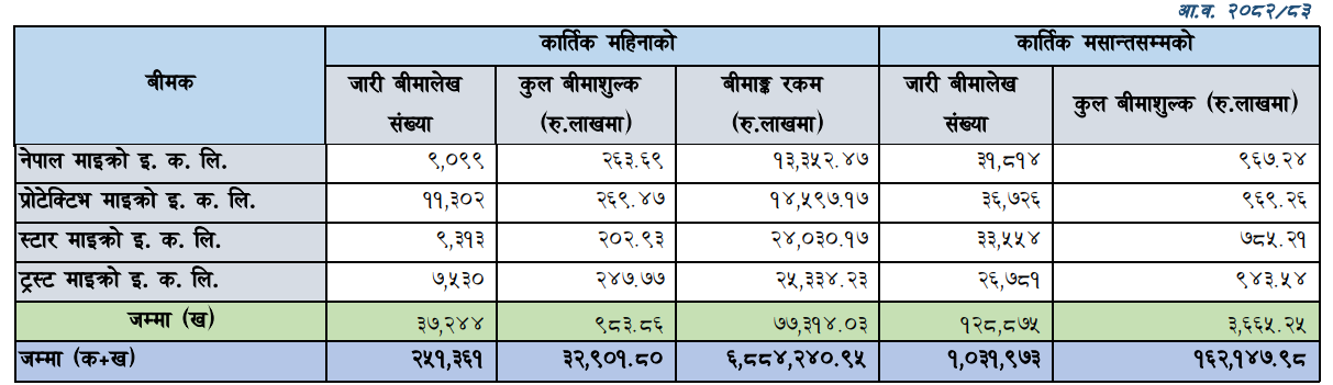 त्यसैगरी दोस्रोमा नेपाल माइक्रो इन्स्योरेन्स कम्पनीले यस अवधिमा ९ करोड ६७ लाख रुपैयाँ कुल बीमाशुल्क आर्जन गर्न सफल भएको छ । ट्रष्ट माइक्रोे इन्स्योरेन्स कम्पनीले ९ करोड ४३ लाख र स्टार माइक्रोले ७ करोड ८५ लाख रुपैयाँको ब्यवसाय गरेका हुन् ।