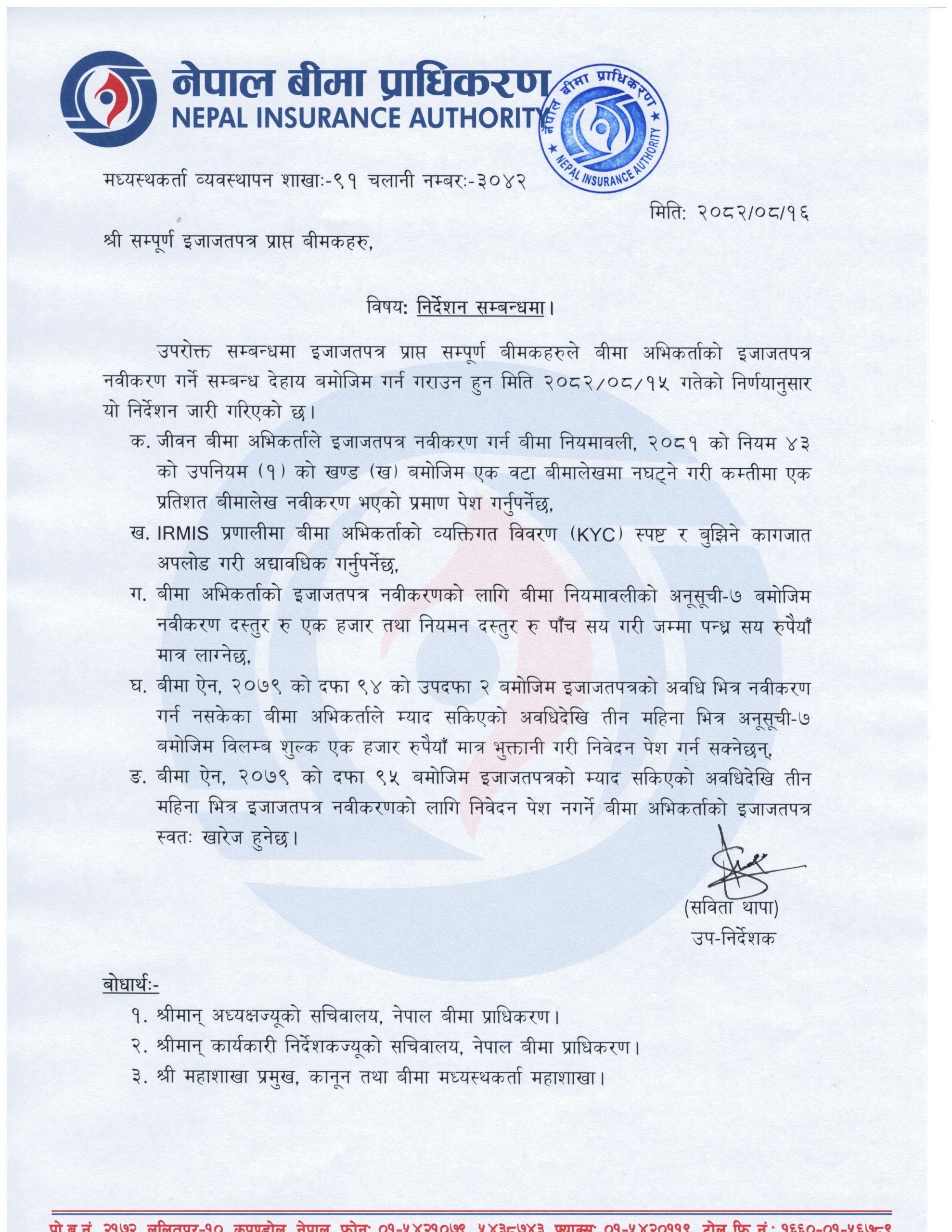 बीमा प्राधिकरणद्वारा बीमा अभिकर्ताको इजाजतपत्र नवीकरण सम्बन्धी निर्देशन जारी, के आयो नयाँ ब्यवस्था?