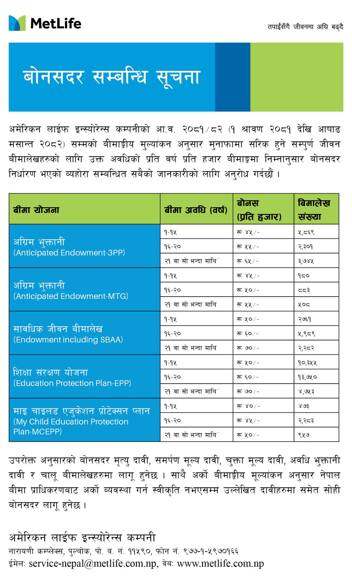 मेटलाइफको नयाँ बोनसदर सार्वजनिक, बीमितले ७० रुपैयाँसम्म बोनस पाउने
