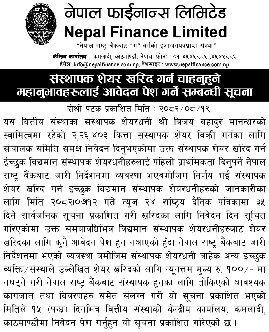 काठमाडौं । नेपाल फाइनान्स लिमिटेडले संस्थापक शेयरधनी विजय बहादुर मानन्धरको नाममा रहेको २ लाख २६ हजार ४०३ कित्ता संस्थापक शेयर बिक्रीमा राखेको छ।