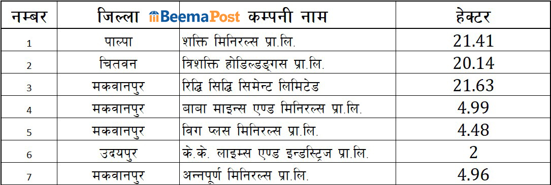 सोही नाफामा आधारित रही ७ कम्पनी ४ जिल्लाका राष्ट्रिय वन विनाशको चरणमा जाने भएका हुन् । शक्ति मिनिरल्सलाई चुनढुङ्गा उत्खनन कार्यको लागि माथागढी गाउँपालिका वडा नं ७ मा रहेको राष्ट्रिय वनको २१.४१ हेक्टर, त्रिशक्ति होल्डिङ्गसलाई चुनढुङ्गा उत्खनन कार्यका लागि राप्ती नगरपालिका वडा नं १३ मा रहेको राष्ट्रिय वनको २०.१४ हेक्टर, रिद्धि सिद्धि सिमेन्टलाई चुनढुङ्गा उत्खनन कार्यको लागि मकवानपुर जिल्ला भिमफेदी गाउँपालिका वडा नं ७ मा रहेको राष्ट्रिय वनको २१.६३ हेक्टर र बाबा माइन्स एण्ड मिनिरल्सलाई चुनढुङ्गा उत्खनन कार्यको लागि मकवानपुर जिल्लाको भिमफेदी गाउँपालिका वडा नं ५ मा रहेको राष्ट्रिय वनको ४.९९ हेक्टर वन–जग्गा प्रयोग गर्न स्वीकृति दिने निर्णय मन्त्री परिषद्ले गरेको हो ।