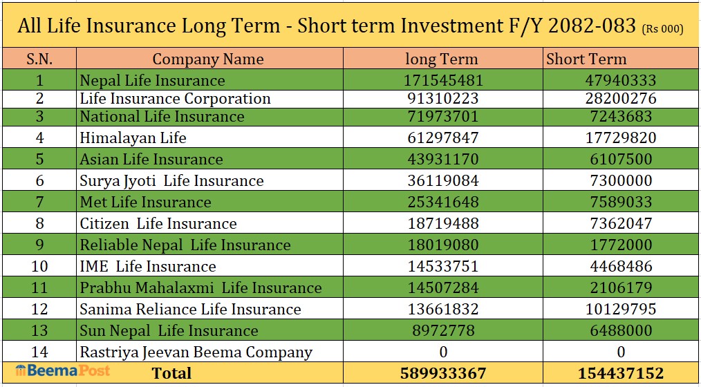 एशियन लाइफ इन्स्योरेन्सको दिर्घकालीन लगानी ४३ अर्ब ९३ करोड रुपैयाँ, सूर्यज्योति लाइफ इन्स्योरेन्सको ३६ अर्ब ११ करोड रुपैयाँ, मेट नेपाल लाइफको २५ अर्ब ३४ करोड रुपैयाँ, सिटिजन लाइफ इन्स्योरेन्सको १८ अर्ब ७१ करोड रुपैयाँ, रिलायबल नेपाल लाइफ इन्स्योरेन्सको १८ अर्ब एक करोड रुपैयाँ, आइएमई लाइफ इन्स्योरेन्स र प्रभु महालक्ष्मी लाइफ इन्स्योरेन्सको १८ अर्ब रुपैयाँ लगानी रहेको छ ।