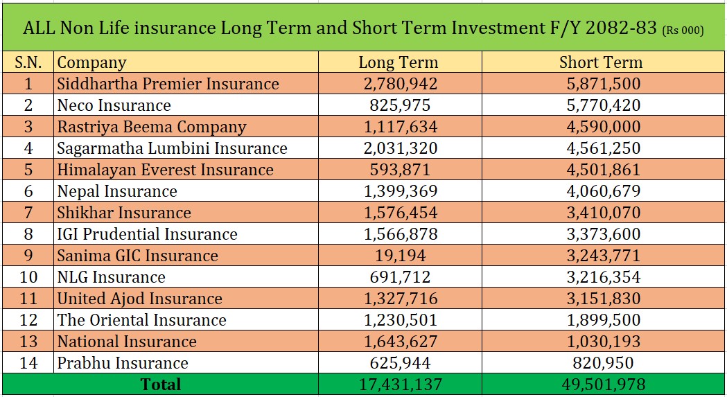 निर्जीवन बीमा कम्पनीहरुले छोटो अवधिको लगानीलाई बढी प्राथमिकता दिदै करिव ५० अर्ब लगानी गरेका छन् । कम्पनीहरुले दिर्घकालिन लगानीलाई १७ अर्ब रुपैयाँमा सीमित बनाएका छन् ।