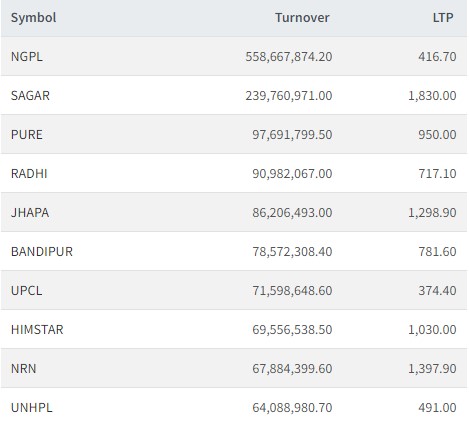 त्यसपछि सागर डिष्टिलरीको २३ करोड ९७ रुपैयाँ, पियोर इनर्जीको ९ करोड ७६ लाख रुपैयाँ, राधी विद्युतको ९ करोड ९ लाख रुपैयाँ, झापा इनर्जीको ८ करोड ६२ लाख रुपैयाँ र बन्दिपुर केवलकारको ७ करोड ८५ लाख रुपैयाँ बढीको शेयर किनबेच भएको छ।
