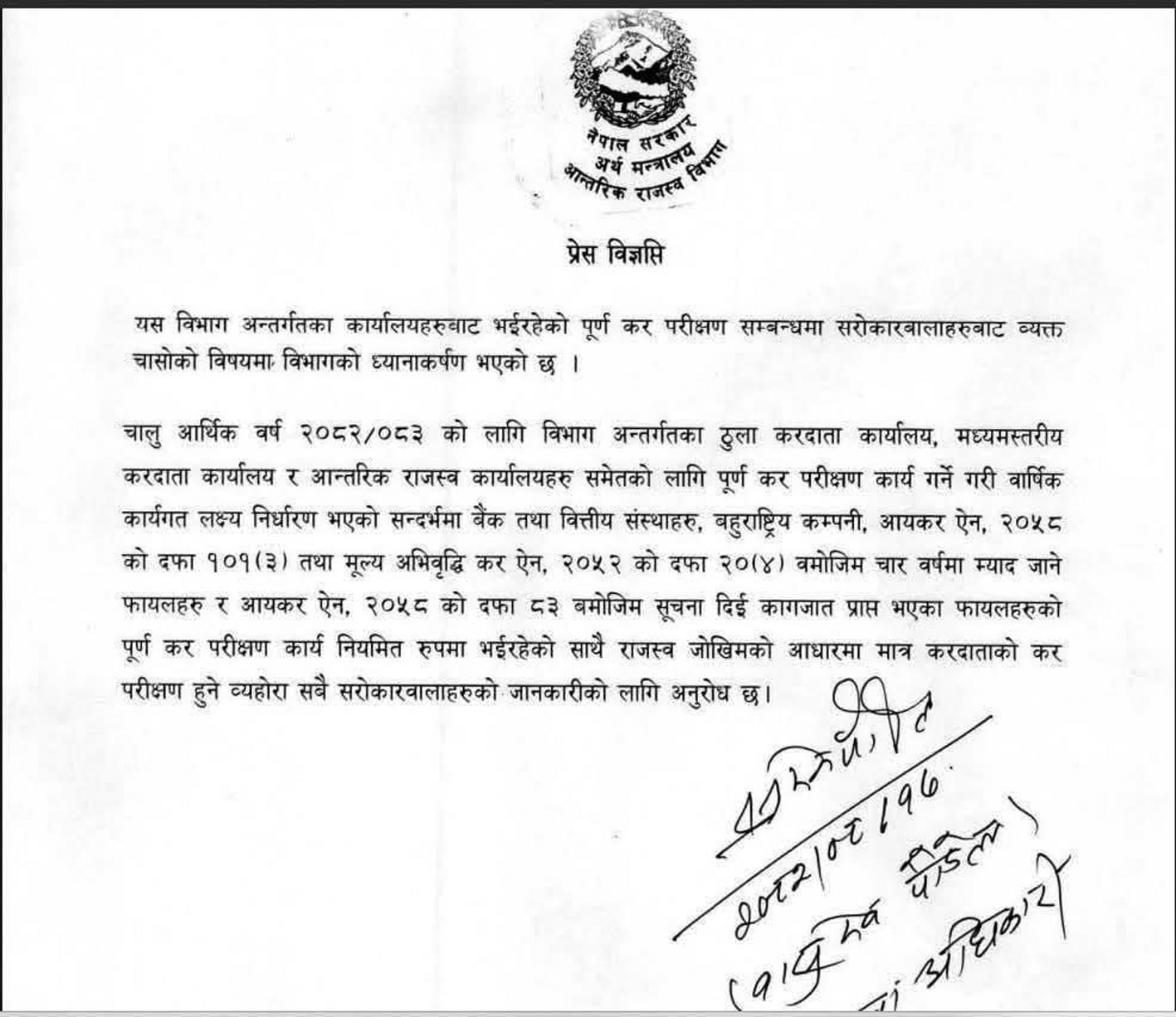 विभागका अनुसार चालु आर्थिक वर्ष २०८२/८३ का लागि पूर्ण कर परीक्षण विभागीय वार्षिक कार्यगत लक्ष्यकै हिस्सा हो । यसअन्तर्गत ठूला करदाता कार्यालय, मध्यमस्तरीय करदाता कार्यालय तथा आन्तरिक राजस्व कार्यालयहरूलाई आफ्नो अधिकारक्षेत्रभित्रका करदातामाथि विस्तृत परीक्षण गर्न निर्देशन गरिएको हो । कर छलीका सम्भावना बढी हुने क्षेत्र पहिचान गर्न विभागले जोखिम–आधारित परीक्षण प्रणालीलाई प्राथमिकता दिएको छ । बजारमा कागजी कारोबार बढिरहेको, भन्सार मूल्य कम देखाउने प्रवृत्ति चर्किएको, बिल–बिना बिक्री, स्टक हेरफेर, आयकम भुक्तानीमा अनियमितता, भ्याज विवरण समयमा नबुझाउने जस्ता कार्य बढेपछि अब परीक्षण ‘दैरै’ होइन ‘चुस्त’ बनाइनेछ ।