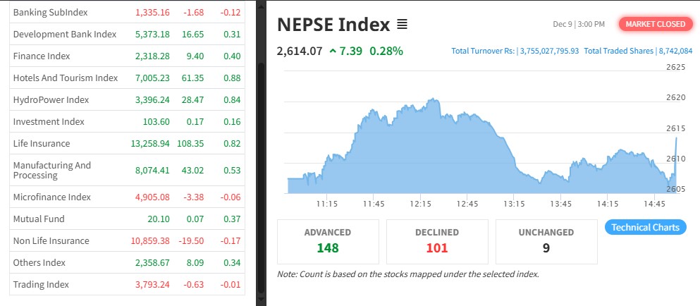 नेपाल स्टक एक्सचेञ्ज (नेप्से) ७.३९ अकंले बढेर २६१४.१४ बिन्दुमा कायम भएको छ । आज ३३१ कम्पनीको ८७ लाख ४२ हजार कित्ता शेयर किनबेच हुँदा ३ अर्ब ७५ करोड ५० लाख रुपैयाँको शेयर कारोबार भएको हो ।