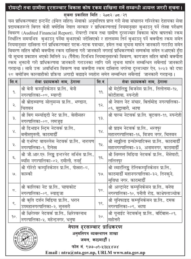 काठमाडौं । नेपाल दूरसञ्चार प्राधिकरणले २० वटा इन्टरनेट सेवाप्रदायक कम्पनीलाई ३५ दिनभित्र रोयल्टी र ग्रामीण दूरसञ्चार विकास कोष (आरटीडीएफ) शुल्क तिर्न सार्वजनिक रूपमा ताकेता गरेको छ।