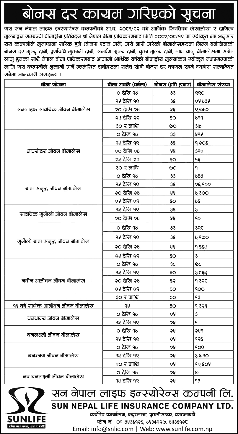 सन नेपाल लाइफद्वारा नयाँ बोनसदर सार्वजनिक, बीमितले ८० रुपैयाँसम्म बोनस पाउने