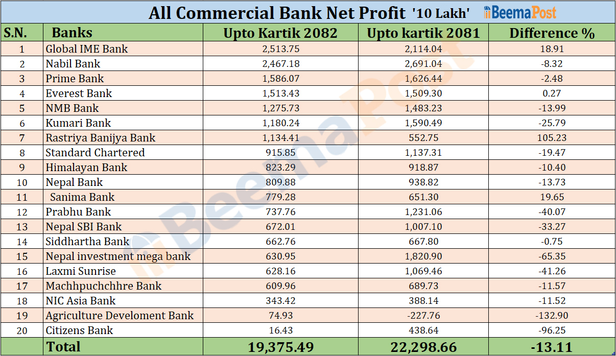 १३ प्रतिशतले घट्यो वाणिज्य बैंकको नाफाः चार महिनामा कमाए साढे १९ अर्ब, कुनको कति ?