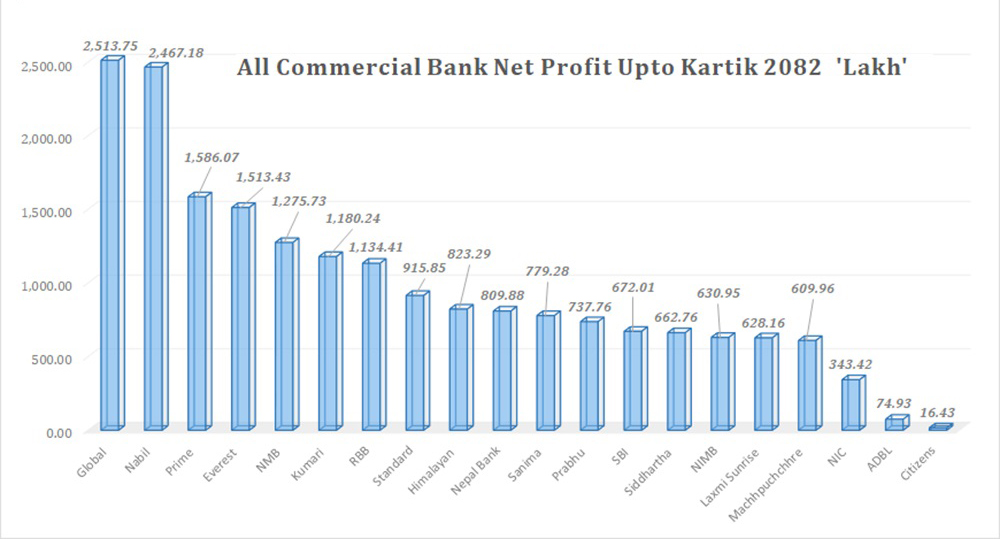 चालु आर्थिक वर्षको कात्तिक मसान्तसम्मको अवधिमा धेरै नाफा आर्जन गर्ने सूचीको पहिलो नम्बरमा ग्लोबल आईएमई बैंक रहेको छ । यसअवधिमा बैंकले २ अर्ब ५१ करोड ३७ लाख रुपैयाँ नाफा आर्जन गरेको छ । जुन गत आर्थिक वर्षको सोहि अवधिको तुलनामा १८.९१ प्रतिशतले बढी हो ।