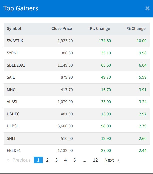 शेयर बजारमा आज विभिन्न सेक्टरका ९८ वटा कम्पनीहरुको शेयरमूल्यमा हरियाली छाएको छ । जसमा आज स्वस्तिक लघुवित्त र एसवाई प्यानलको शेयरमूल्यमा सकारात्मक सर्किट लागेको छ ।