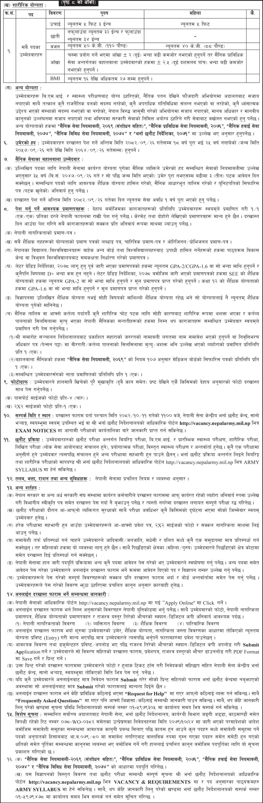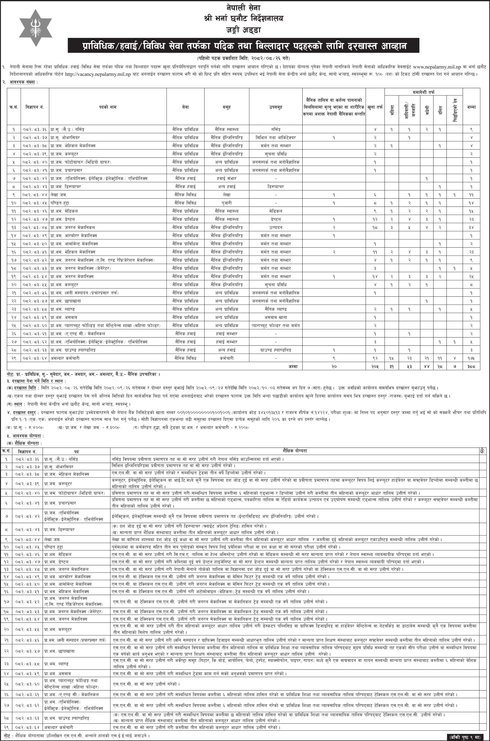 सेनाले सैनिक स्वास्थ्य, सैनिक इन्जिनियरिङ्ग, अन्य प्राविधिक, अन्य हवाई, लेखा, पुजारी, कर्मचारी समूहमा नयाँ भर्ना खुलाएको हो। यसमा आज मंसिर २६ गतेदेखि पुस २६ गतेसम्म र दोब्बर दस्तुर तिरेर माघ ३ गतेसम्म आवेदन दिन सकिनेछ।
