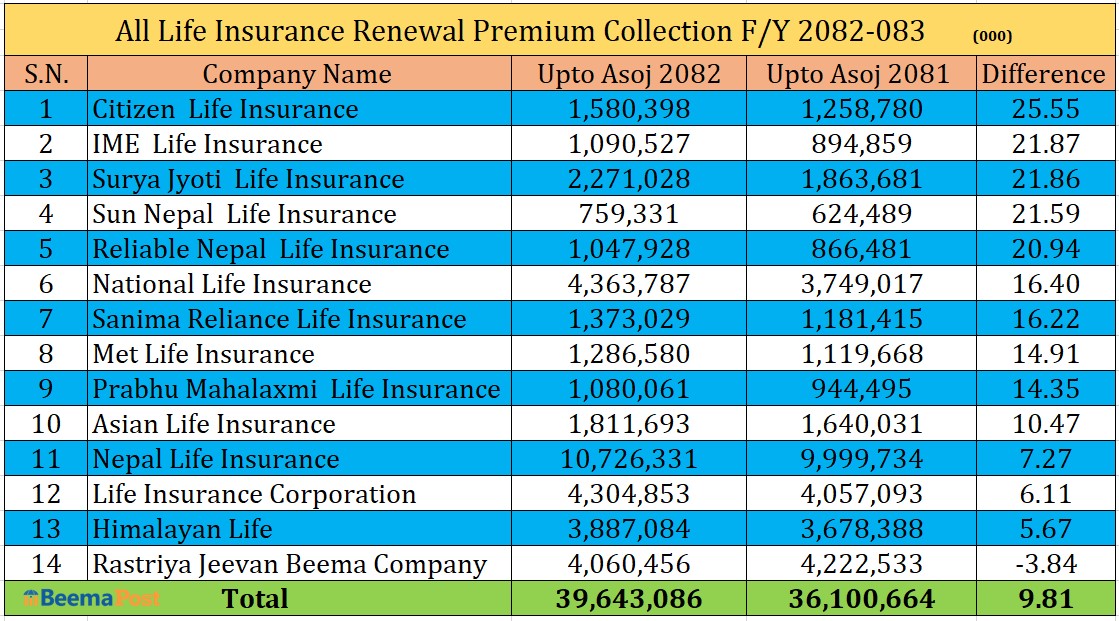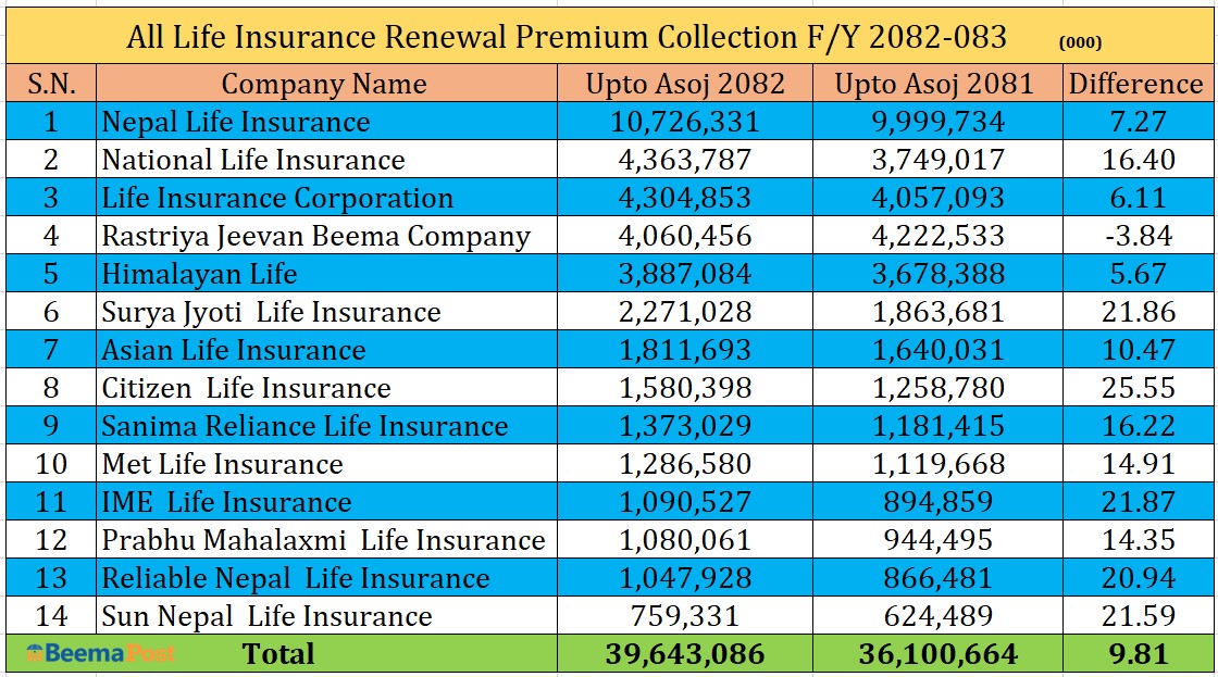 समिक्षा अवधिमा आइएमई लाइफ इन्स्योरेन्सको एक अर्ब नौ करोड पाँच लाख रुपैयाँ, मेट नेपाल लाइफ इन्स्योरेन्सको एक अर्ब २८ करोड ६५ लाख रुपैयाँ, प्रभु महालक्ष्मी लाइफ इन्स्योरेन्सको एक अर्ब ८ करोड रुपैयाँ, रिलायबल नेपाल लाइफ इन्स्योरेन्सको एक अर्ब चार करोड ७९ लाख रुपैयाँ र सन नेपाल लाइफ इन्स्योरेन्सको ७५ करोड ९३ लाख रुपैयाँ नविकरण बीमा शुल्क आर्जन रहेको छ ।