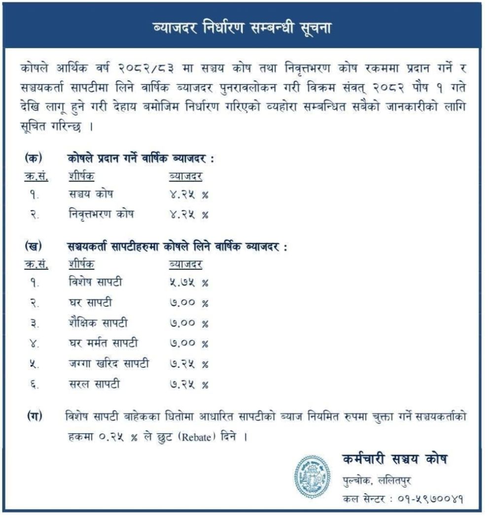 काठमाडौं । कर्मचारी सञ्चय कोषले आर्थिक बर्ष २०८२र८३ मा कोगा तथा निवृत्तभरण कोष रकममा प्रदान गर्ने mर सञ्चयकर्ता सापटीमा लिने बार्षिक ब्याजदर पुनरावलोकन गरी २०८२ साल पुस १ गतेदेखि लागू हुने गरी नयाँ बार्षिक ब्याजदर घोषणा गरेको छ।