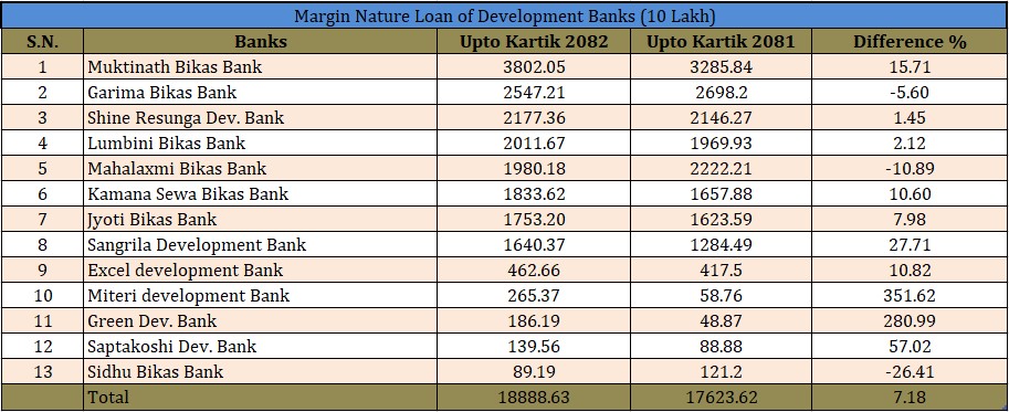 विकास बैंकहरुमा सबैभन्दा बढी शेयर धितो कर्जा प्रवाह गर्नेमा मुक्तिनाथ विकास बैंक रहेको छ । बैंकको शेयर धितो कर्जा १५.७१ प्रतिशतले बढेर ३ अर्ब ८० करोड २० लाख रुपैयाँ रहेको हो ।