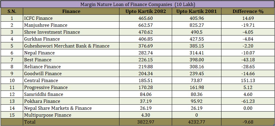 समिक्षा अवधिमा फाइनान्स कम्पनीहरुको शेयर धितो कर्जा भने ९.६८ प्रतिशतले घटेर ३ अर्ब ८२ करोड २९ लाख रुपैयाँमा सिमित भएको छ । गत आर्थिक वर्षको सोहि अवधिमा फाइनान्सहरुले ३ अर्ब २३ करोड २७ लाख रुपैयाँ शेयर धितो कर्जा प्रवाह गरेका थिए ।