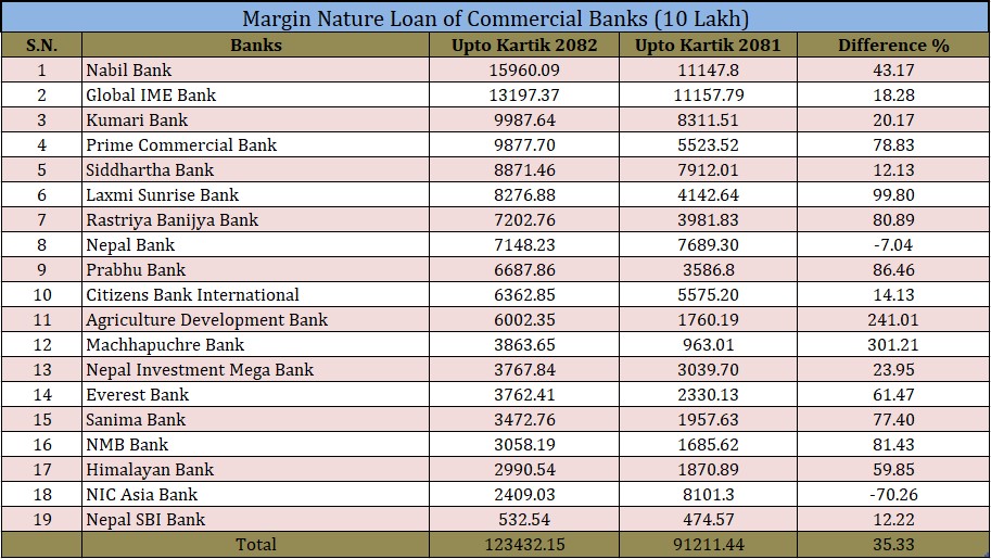 साथै, ग्लोबल आइएमई बैंकको शेयर धितो कर्जा १८ प्रतिशतले बढेर १३ अर्ब १९ करोड, कुमारी बैंकको २० प्रतिशतले बढेर ९ अर्ब ९८ करोड, प्राइम बैंकको ७८ प्रतिशतले बढेर ९ अबै ९८ करोड, सिद्धार्थ बैंकको १२ प्रतिशतले बढेर ८ अर्ब ८७ करोड, लक्ष्मी सनराइज बैंकको १०० प्रतिशतले बढेर ८ अर्ब २७ करोड र राष्ट्रिय वाणिज्य बैंकको ८१ प्रतिशतले बढेर ७ अर्ब २० करोड रुपैयाँ रहेको छ ।