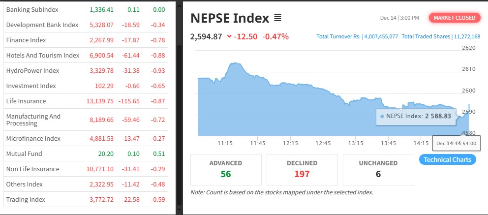 नेपाल स्टक एक्सचेञ्ज (नेप्से) १२.५० अकंले घटेर २५९४.८७ बिन्दुमा कायम भएको छ। आज ३३० कम्पनीको १ करोड १२ लाख ७२ हजार कित्ता शेयर किनबेच हुँदा ४ अर्ब ७४ लाख ५५ हजार रुपैयाँको शेयर कारोबार भएको हो ।