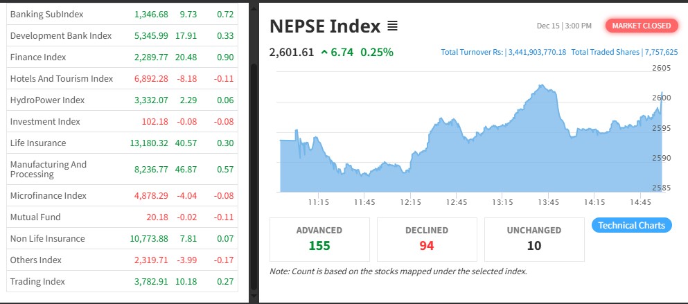 नेपाल स्टक एक्सचेञ्ज (नेप्से) ६.७४ अकंले बढेर २५०१.६१ बिन्दुमा कायम भएको छ । आज ३२९ कम्पनीको ७७ लाख ५७ हजार कित्ता शेयर किनबेच हुँदा ३ अर्ब ४४ करोड १९ लाख रुपैयाँको शेयर कारोबार भएको हो ।