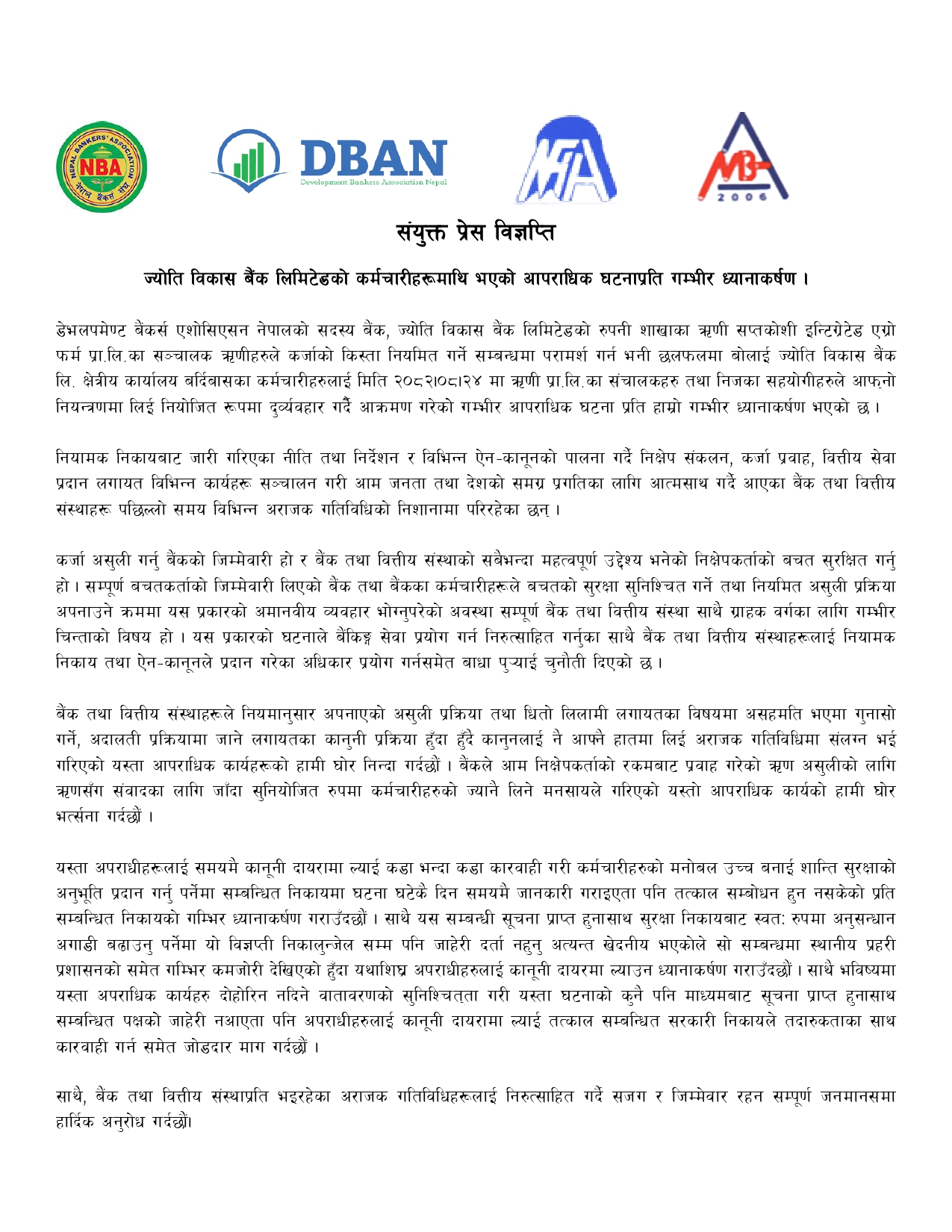 काठमाडौँ। बैंक तथा वित्तीय संस्थाका सीईओहरूको संगठनले ज्योति विकास बैंक लिमिटेडका कर्मचारीहरूमाथि भएको आपराधिक आक्रमणप्रति गम्भीर ध्यानाकर्षण भएको जनाएको छ।