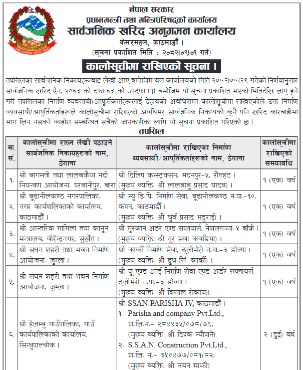 एक वर्षका लागि कालोसूचीमा पर्ने कम्पनीहरूमा रौतहटको दिलिप कन्स्ट्रक्सन, काठमाडौँको न्यु डीपी निर्माण सेवा, कोजु इन्जिनियरिङ एण्ड बिल्डर्स, बाँकेको मुस्कान अर्डर एण्ड सप्लायर्स, बी एण्ड बी कन्स्ट्रक्सन, डोल्पाको कार्की निर्माण सेवा, यु एण्ड आइ निर्माण सेवा र दिनकर कन्स्ट्रक्सन रहेका छन् ।