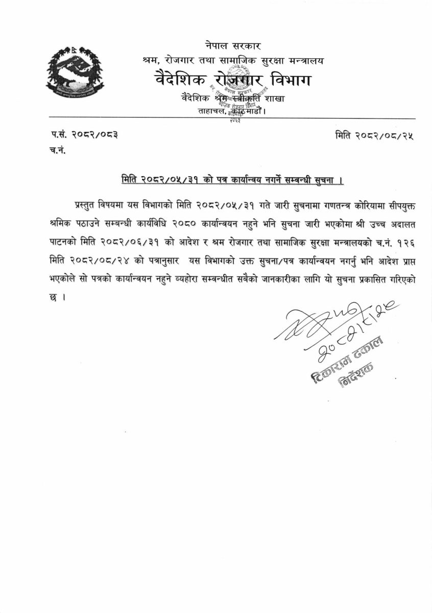 श्रम, रोजगार तथा सामाजिक सुरक्षा मन्त्रालयले मंसिर २४ गते गरेको पत्राचारलाई आधार बनाएर वैदेशिक रोजगार विभागले भोलि पल्टै (२५ मंसिरमा)म्यानपावरमार्फत कोरियामा नेपाली श्रमिक पठाउन पाउने कार्यविधि कार्यान्वयनको बाटो खुलेको सूचना जारी गरिदिएको छ । जसले तत्कालीन मन्त्री भण्डारीसमेतको मिलेमतोमा चलेको असुली धन्दालाई पुर्नजीवित गरिदिएको हो ।
