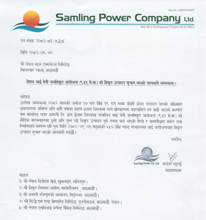 काठमाण्डौ । सामलिङ्ग पावर कम्पनी लिमिटेडद्वारा सञ्चालित माई बेनी जलविद्युत आयोजनाबाट पुनः विद्युत उत्पादन सुचारु भएको छ । ९.५१ मेगावाट क्षमताको उक्त आयोजनाबाट पुस १ गतेदेखि पुनः विद्युत उत्पादन सुचारु भएको हो ।