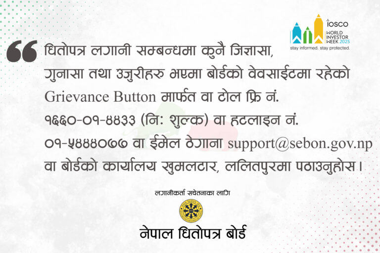 धितोपत्र लगानी सम्बन्धी जिज्ञासा वा उजुरी भए नि:शुल्क सम्पर्क गर्न बोर्डको आग्रह
