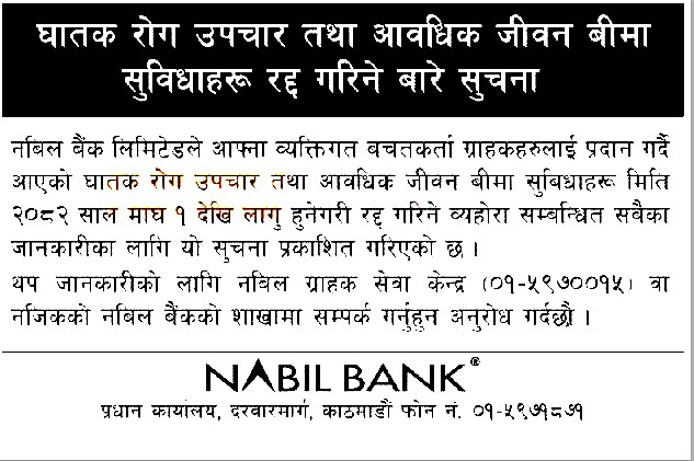 नबिल बैंकले घातक रोग उपचार तथा आवधिक जीवन बीमा सुविधा बन्द गर्ने