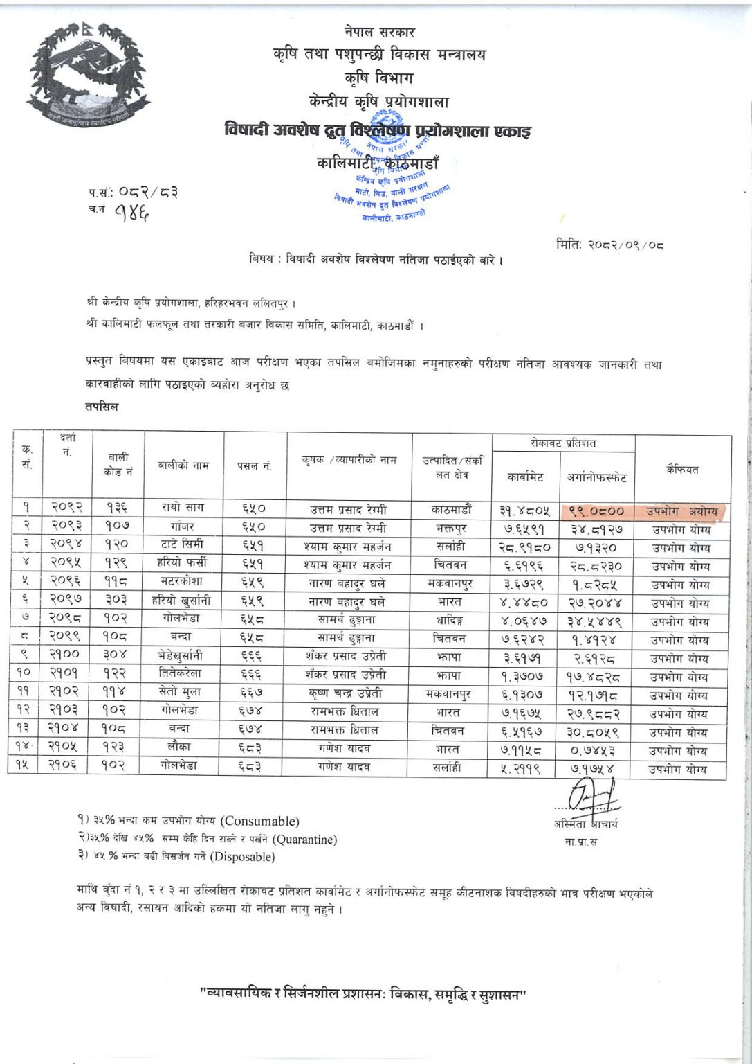 विषादीको मात्रा अत्यन्तै धेरै भएकाले उक्त रायोको साग उपभोगका लागि पूर्ण रूपमा अयोग्य रहेको प्रयोगशालाले जनाएको छ । सरकारी मापदण्डअनुसार अर्गानोफस्फेट विषादी ३५ प्रतिशतभन्दा कम भएमा मात्रै उपभोगयोग्य मानिन्छ । ३५ देखि ४५ प्रतिशतसम्म पाइएमा केही दिन राखेपछि मात्र उपभोग गर्न सकिने व्यवस्था छ भने ४५ प्रतिशतभन्दा बढी भएमा त्यस्ता तरकारी उपभोगका लागि अयोग्य मानिन्छन् ।