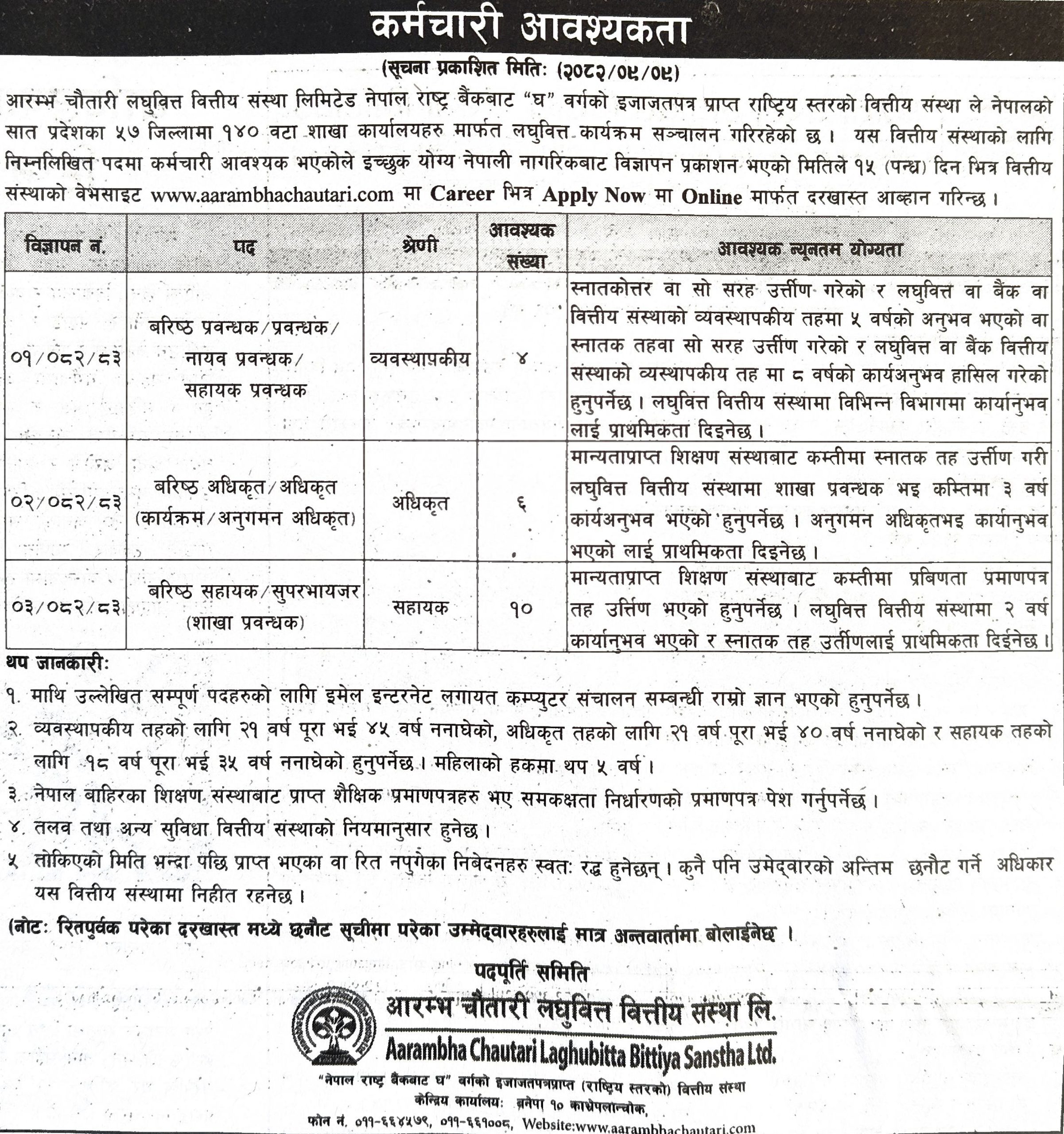आरम्भ चौतारी लघुवित्तले माग्यो कर्मचारी, कति चाहिन्छ योग्यता?