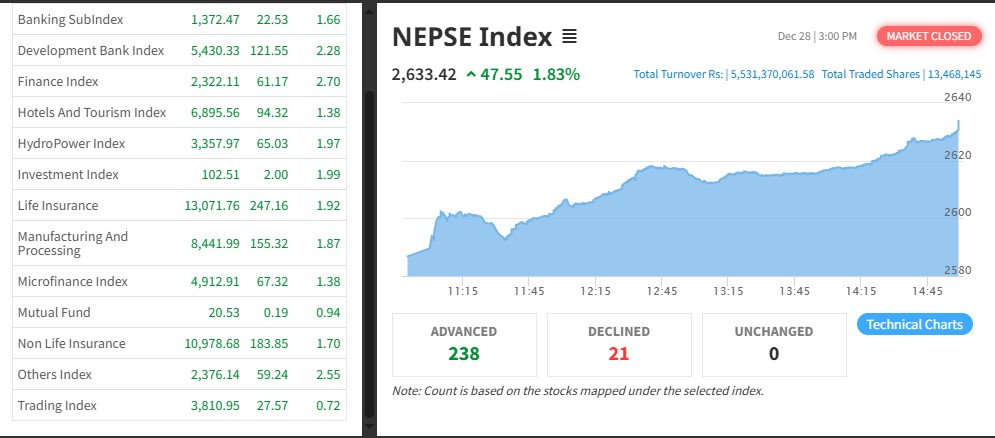 नेपाल स्टक एक्सचेञ्ज (नेप्से) ४७.५५ अकंले बढेर २६३३.४२ बिन्दुमा कायम भएको छ । आज ३२८ कम्पनीको १ करोड ३४ लाख ६८ हजार कित्ता शेयर किनबेच हुँदा ५ अर्ब ५३ करोड १३ लाख रुपैयाँको शेयर कारोबार भएको हो ।