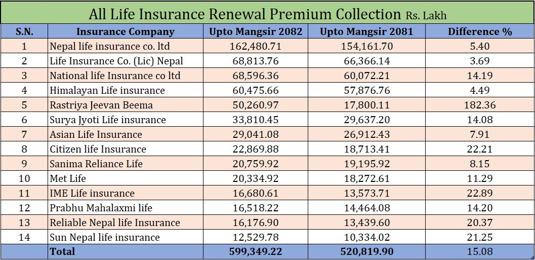 नविकरण बीमा शुल्क आर्जन १५% ले बढ्यो, अग्रस्थानमा नेपाल लाइफ र एलआईसी, ग्रोथमा को अगाडी ?