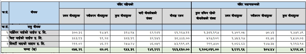 मंसिर महिनाको मात्रै तथ्यांक हेर्ने हो भने क्रेष्ट माइक्रो लाइफले सर्वाधिक ३ करोड ८३ लाख, गार्डियन माइक्रो लाइफले ३ करोड १४ लाख र लिवर्टी माइक्रो लाइफले २ करोठ ५७ लाख रुपैयाँ कुल बीमाशुल्क आर्जन गरेका छन्।