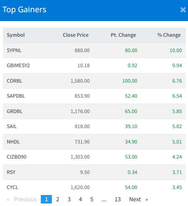 त्यस्तै, कर्पोरेट डेभलपमेन्ट बैंकको ६.७६ प्रतिशत, सप्तकोशी डेभलपमेन्ट बैंकको ६.५४ प्रतिशत, ग्रीन डेभलपमेन्ट बैंक लगायतको शेयरमूल्य बृद्धि भएको छ ।
