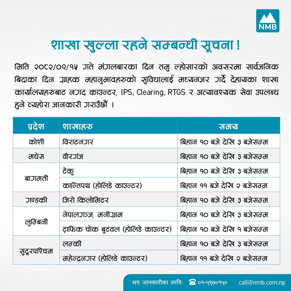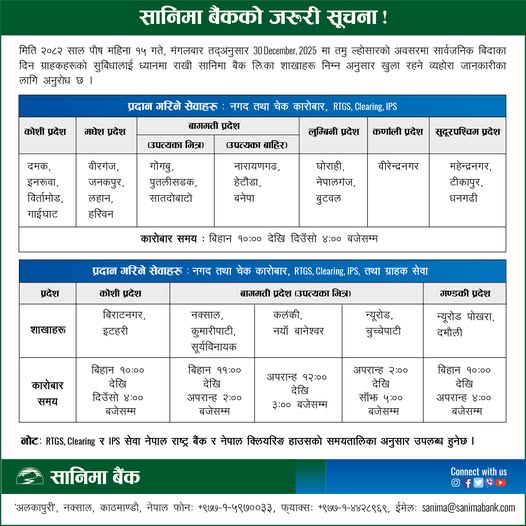 बैंकहरुले आफ्ना ग्राहकलाई नियमित सेवा प्रवाहमा अवरोध नहोस् भन्ने उद्देश्यले बिदाको दिनमा समेत शाखा सञ्चालन गर्ने भएका हुन्। केही बैंकहरुले आफ्ना शाखा तथा काउन्टर खुला रहने सूचना सामाजिक सञ्जाल र वेबसाइटमार्फत सार्वजनिक गरिसकेका छन्।