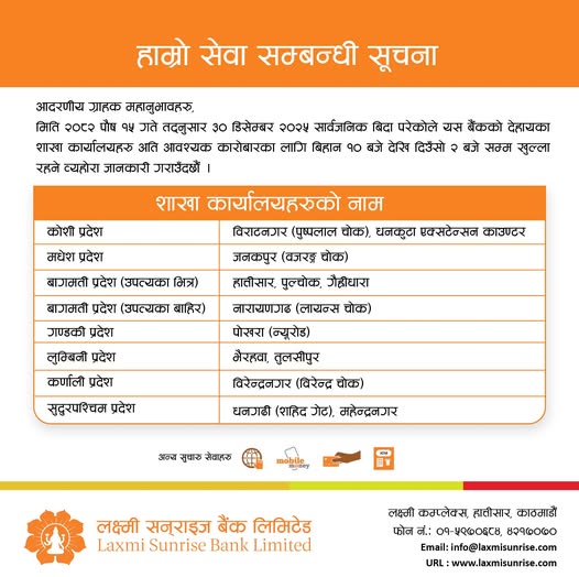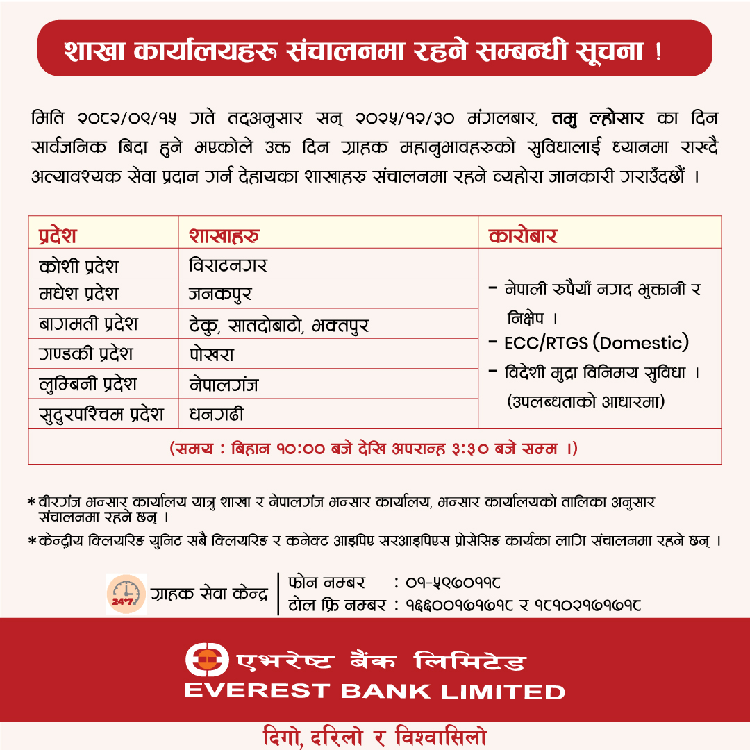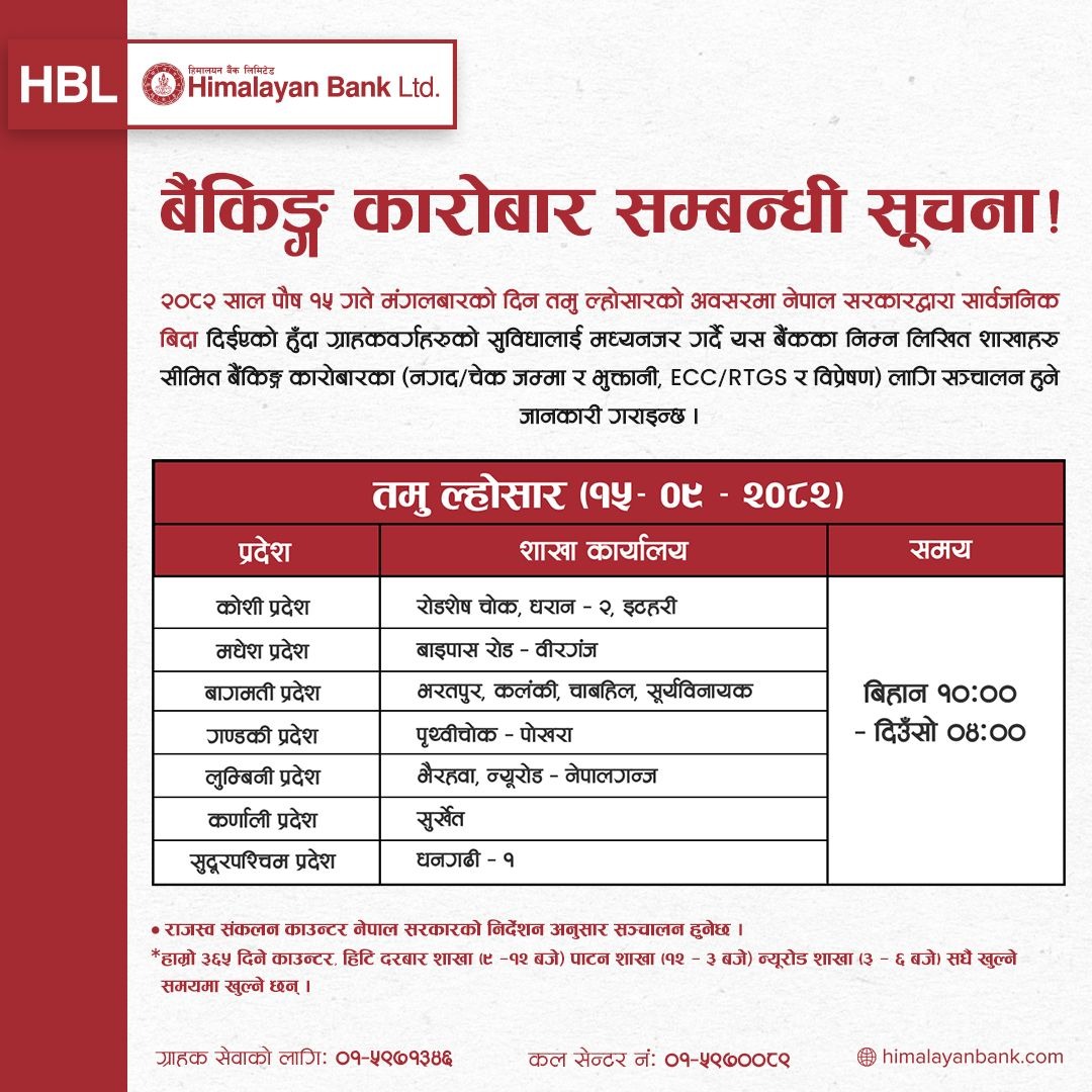काठमाडौँ । तमु ल्होसारको अवसरमा भोलि देशभर सार्वजनिक बिदा दिइएको भए पनि अधिकांश बैंकहरुले आफ्ना शाखामार्फत सेवा सञ्चालन गर्ने भएका छन्। वाणिज्य बैंक तथा विकास बैंकहरूले ग्राहक सुविधालाई मध्यनजर गर्दै केहि शाखा खुला राख्ने निर्णय गरेका हुन्।