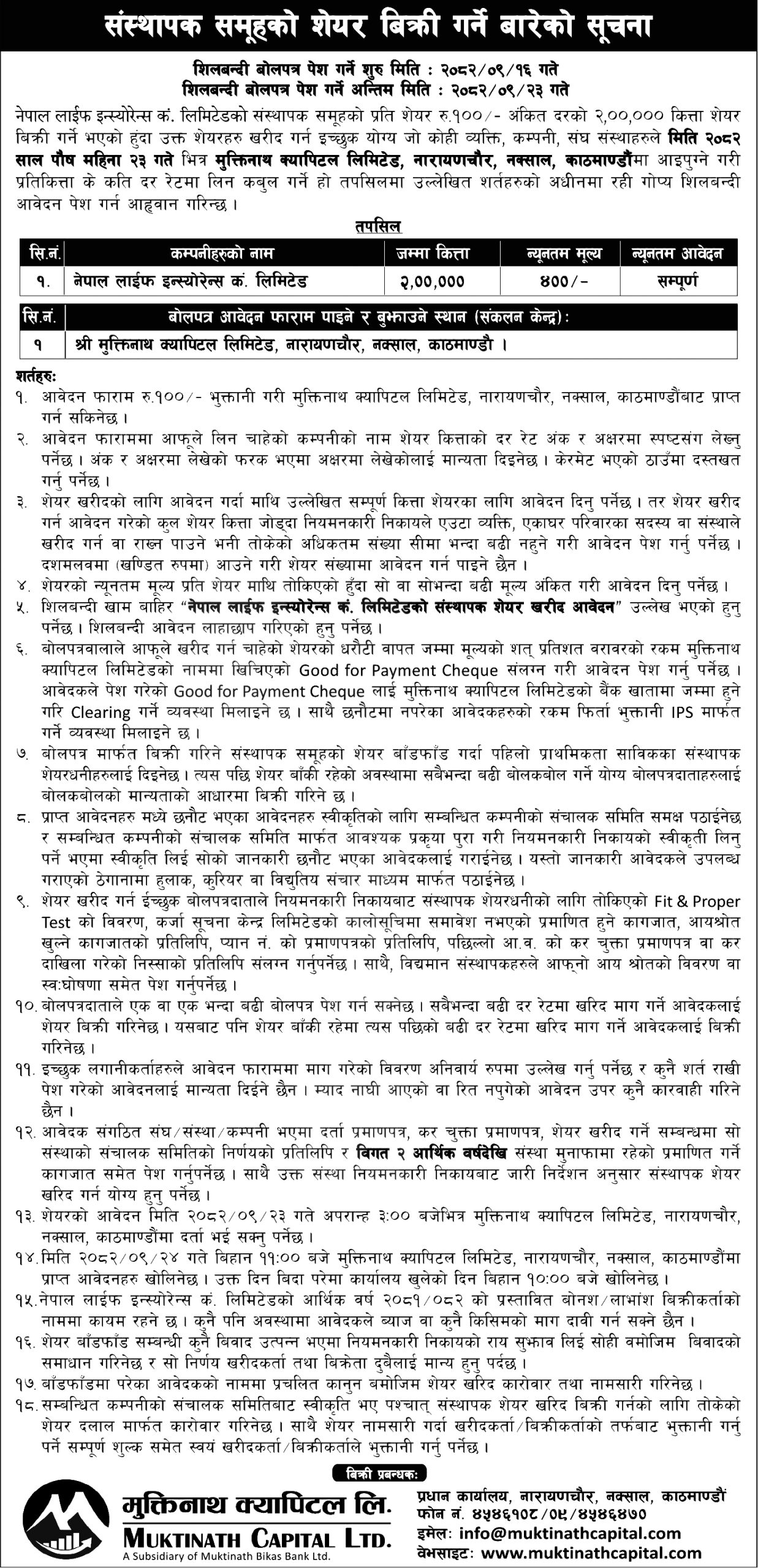 बोलपत्र आज पुस १६ गतेदेखि पुस २३ गतेभित्र काठमाडौंको नक्सालस्थित बिक्री प्रबन्धक मुक्तिनाथ क्यापिटल लिमिटेडको कार्यालयमा पेश गर्नु पर्नेछ। यो बोलपत्र पुस २४ गते बिहान ११ बजे क्यापिटलको कार्यालयमा खोलिने कम्पनीले जनाएको छ।