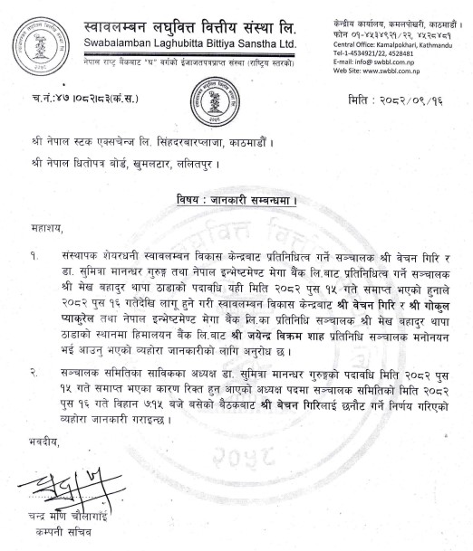 संस्थाको सञ्चालकमा गोकुल प्याकुरेल र जयेन्द्र विक्रम शाह नियुक्त भएका छन् । संस्थाको पुष १६ गते अर्थात आज बिहान ७ः१५ मा बसेको सञ्चालक समितिको बैठकको निर्णय अध्यक्ष र सञ्चालक नियुक्त गरिएको कम्पनी सचिव चन्द्र मणि चौलागाईले बताए ।
