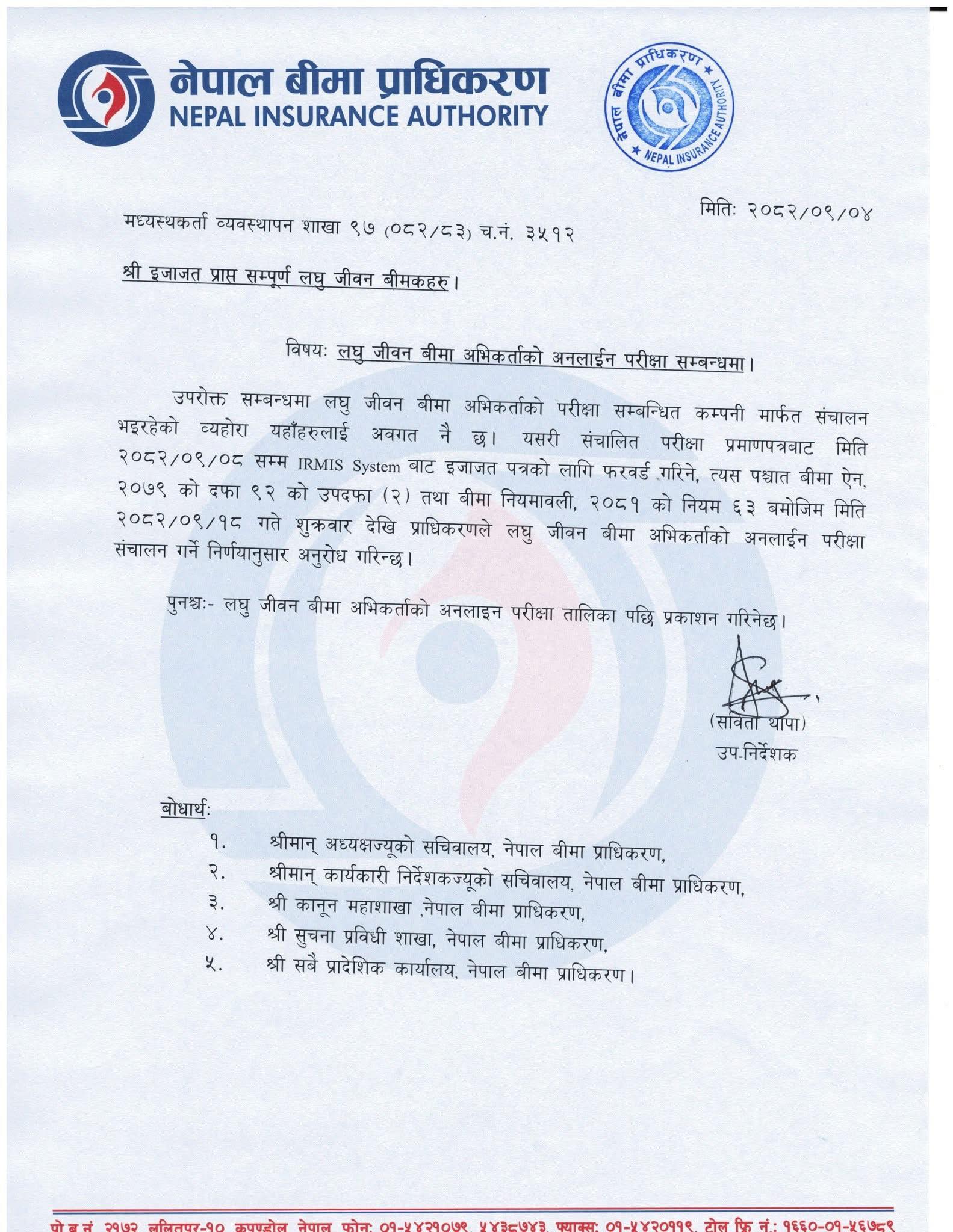 प्राधिकरणले लघु जीवन बीमा अभिकर्ताको परीक्षा सम्बन्धित कम्पनी मार्फत सञ्चालन भइरहेको जनाउँदै सञ्चालित परीक्षा प्रमाणपत्रबाट पुस ८ गतेसम्म आईआरएसआईएस सिस्टमबाट इजाजत पत्रको लागि फरवार्ड गरिएको जनाएको छ।