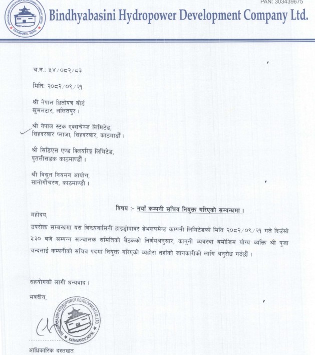 काठमाडौं । विन्ध्यावासिनी हाइड्रोपावर डेभलपमेन्ट कम्पनी लिमिटेडको कम्पनी सचिवमा पुजा चन्दलाई नियुक्त गरिएको छ ।